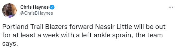 利拉德至少伤停10天,开拓者另一名球员利特尔因左脚踝扭伤,至少伤停一周;本赛季,21岁利特尔为开拓者出战21场比赛,场均上场22.4分钟能够拿到8.3分5.3篮板,年薪是231万美元。