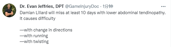 上一场比赛,利拉德因伤缺战活塞,如今的检查结果出炉,确诊为腹部肌腱受伤,这是连接到盆骨的六块腹直肌的一种损伤,医学专家Evan Jeffries表示利拉德至少伤停10天,跑步、扭动身体都会受到很大的影响。