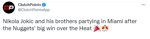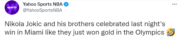 赢球之后,约基奇兄弟们在迈阿密举办庆祝派对,由此可见他们对这场比赛的重视程度,赢球就像实现复仇似的;美媒Yahoo Sports NBA调侃:昨晚约基奇兄弟在迈阿密赢球,就像夺得奥运金牌似的。