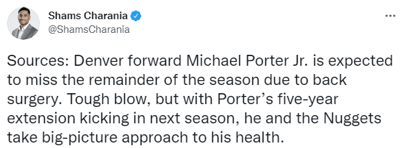 据名记沃纳罗斯基报道,小波特的经纪人表示预计他可以完全康复,大概伤停时间将在术后进行评估。如果联盟确认小波特赛季报销,掘金可以申请260万美元的伤病特例。