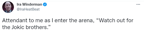 热火记者Ira Winderman发推写道,有人提醒他小心约基奇的两个哥哥。