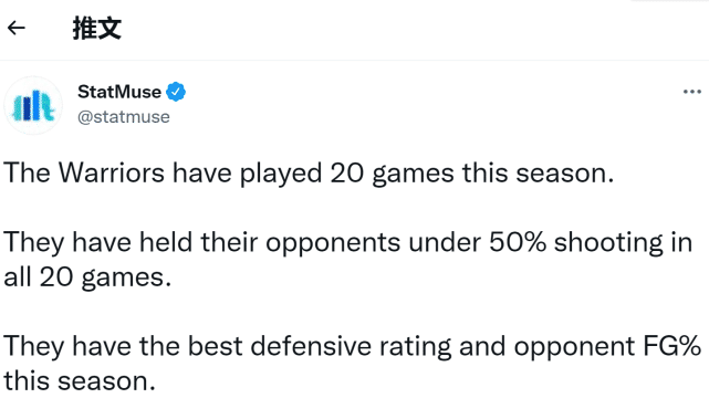 进攻端,勇士20场比赛全部超过100分,表现非常稳定,113的进攻效率仅次于爵士排在联盟第二。场均助攻、场均三分命中数都是联盟第一,投篮命中率联盟第二。