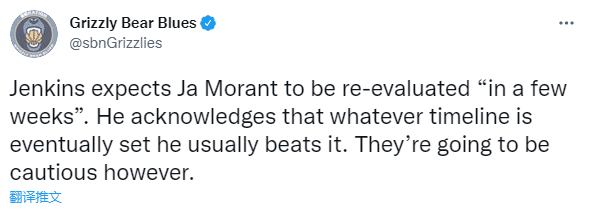 不久前,灰熊主帅泰勒-詹金斯透露莫兰特避免了重大伤病,不过他会缺席几周时间,目前还没有复出时间表,将在几周后接受复查。