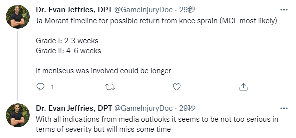 对于莫兰特的伤势,医学专家Evan Jeffries分析,莫兰特可能从膝盖扭伤中恢复的时间表; 一级扭伤需要休战2-3周;若是二级扭伤则伤停4-6周;如果半月板损伤的话可能会缺席更长;从目前情况来看,莫兰特伤势似乎并不太严重,但会错过一些时间。