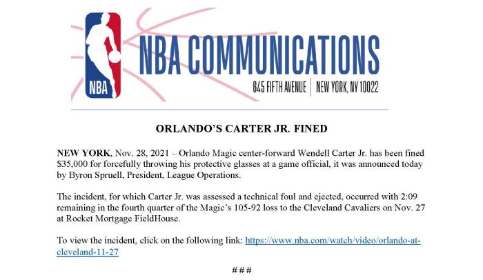 魔术前锋温德尔-卡特因在裁判面前怒摔护目镜,被联盟罚款3.5万美元。