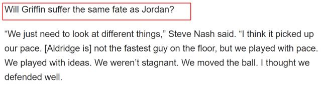 篮网媒体在报道这一变化时,提到了小乔丹的名字:“格里芬会遭遇和小乔丹一样的命运吗?”上赛季,篮网就曾经对五号位进行调整,签下阿尔德里奇后用他取代了小乔丹的首发位置,就算后来阿德因心脏问题退役,小乔丹也没回到轮换中,被格里芬取代。