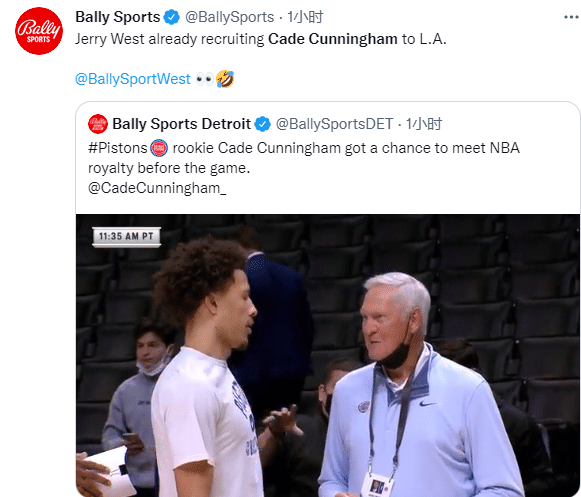 值得一提的是,坎宁安和快船顾问杰里-韦斯特站在场边交流,logo男应该是给后辈一些建议和指导,还做了一些手势和动作;活塞官方晒出坎宁安和NBA传奇同框聊天的画面;不过美媒Bally Sports调侃这一幕,发推写道:杰里-韦斯特真早招募坎宁安来洛杉矶。