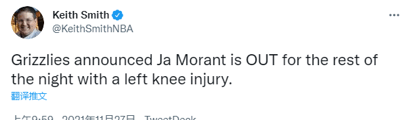 离场前,莫兰特上场8分钟1投0中拿到2分1篮板1助攻1盖帽,已经离场接受检查;随后灰熊官方宣布,莫兰特因左膝受伤而退出比赛,预计将在明天接受核磁共振检查,从而进一步确认伤情,希望十字韧带或者半月板无碍,医学专家Rajpal Brar担忧莫兰特的十字韧带和半月板受损,希望别有大事。