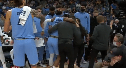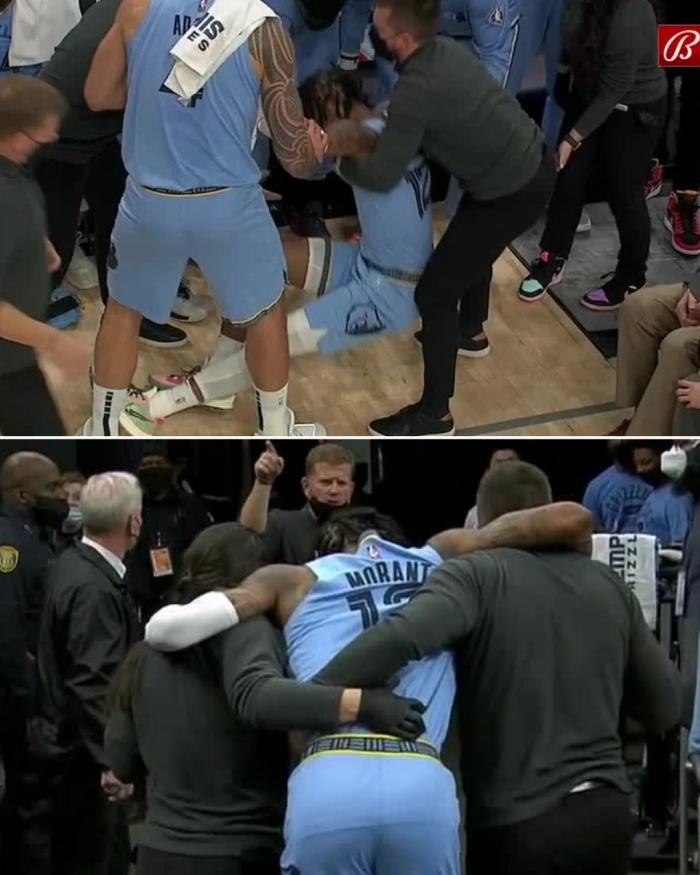 第一节,莫兰特持球进攻,被科林斯和赫尔特包夹,之后莫兰特把球传给队友,此时莫兰特左腿已经受伤,这应该是一次非接触性受伤,第一时间摸了一下膝盖;莫兰特一瘸一拐,单腿跳着坐回替补席,离场前,莫兰特躺在地板上,捂着膝盖十分痛苦,之后莫兰特左腿无法用力,被工作人员搀扶返回更衣室。