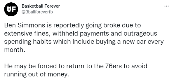 来源:24直播网11-26 11:4724直播网11月26日讯 ,据美媒报道Basketball Forever报道,76人球星本-西蒙斯因巨额罚款、拒付款项以及每月买新车等不合理的消费习惯而破产,他可能被迫为76人出战从而避免资金耗尽。