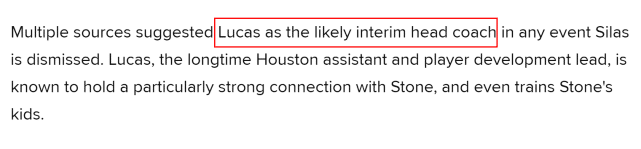 多位消息人士透露,任何时候塞拉斯被解雇,68岁的助教卢卡斯都很可能会出任临时主帅。卢卡斯已经在火箭长期担任助教,和斯通关系非常密切,甚至帮助训练斯通的孩子。目前,种种迹象表明,塞拉斯的帅位已经不稳了,在这个赛季结束后,他的合同也只剩下一年了。