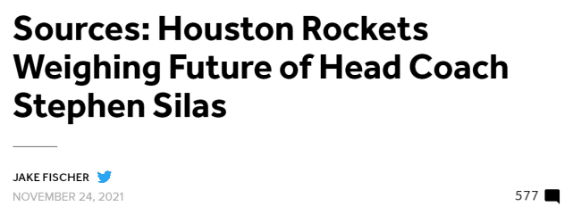 来源:24直播网11-25 16:1624直播网讯 北京时间11月25日,据知名美媒Bleacher Report报道,多位消息人士透露,火箭队正在权衡主教练斯蒂芬-塞拉斯的未来。上周末,国王解雇了主教练卢克-沃顿,而塞拉斯可能成为联盟下一位被炒的主帅。