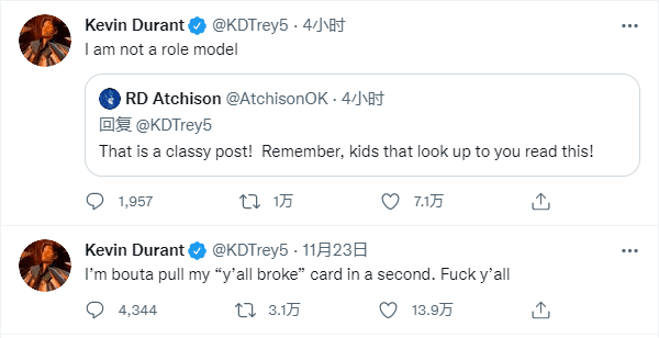 33岁杜兰特依旧是当今联盟“最强键盘侠”,只要看到不满的言论,杜小帅基本都会强势回应,究竟是真性情还是敏感,这一直是一个争议话题。