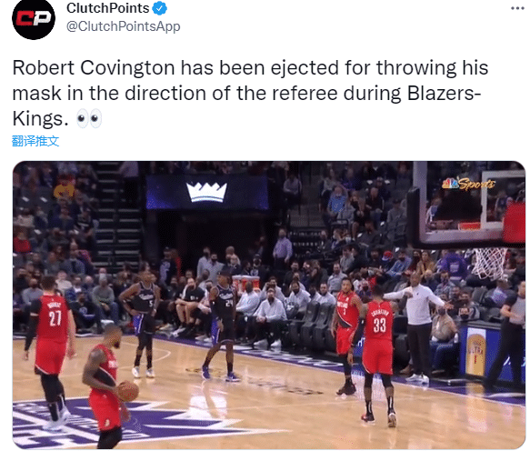 在开拓者和国王比赛中,考文顿摘掉面具并且扔向裁判,吃到技术犯规并且被驱逐离场;此前国王球员霍姆斯因扔发带被驱逐离场,之后被追加罚款1.5万美元。