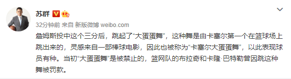 湖人和步行者赛后,苏群专门谈到了詹姆斯的争议庆祝动作,发文直言詹姆斯投中三分后,跳起了“大蛋蛋舞”,这种“卡塞尔大蛋蛋舞”是被联盟禁止的,篮网队的布拉奇和卡隆·巴特勒曾因跳这种舞被罚款。