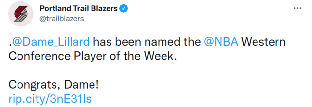 上周,开拓者取得3胜0负的佳绩,利拉德场均贡献28.3分2.7篮板8.3助攻,投篮命中率43.3%,三分命中率39.3%,罚球命中率100%(22罚全中)。开拓者官方晒图祝贺利拉德当选西部周最佳。利拉德13次当选周最佳,也是开拓者队史上最多的。
