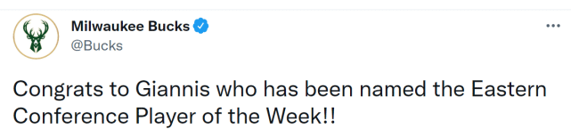 上周,字母哥帮助雄鹿取得3胜0负的战绩,他场均贡献33.3分16篮板5助攻1.7抢断2.7盖帽,投篮命中率58.2%,三分命中率36.4%,表现相当全面。这是雄鹿本赛季首次拿到三连胜,字母哥是最大的功臣。雄鹿官方晒图祝贺字母哥当选东部周最佳。