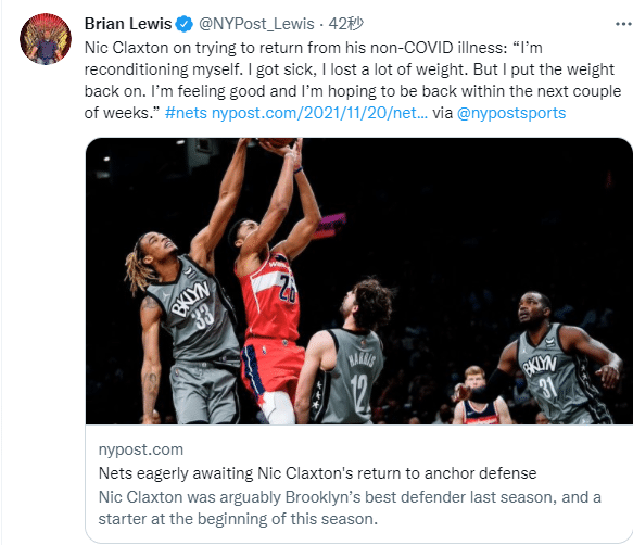 篮网新星自曝生病缺战!一度因病消瘦减重,预计缺几周才能重返赛场