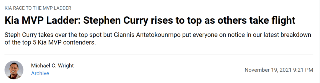 来源:24直播网11-20 15:4624直播网11月20日讯 ,NBA官网公布了第四期的MVP排行榜。库里超越杜兰特,升至第一,杜兰特降至第二,伤愈复出的巴特勒重回前五。以下是详细榜单(括号内为上期排名)——