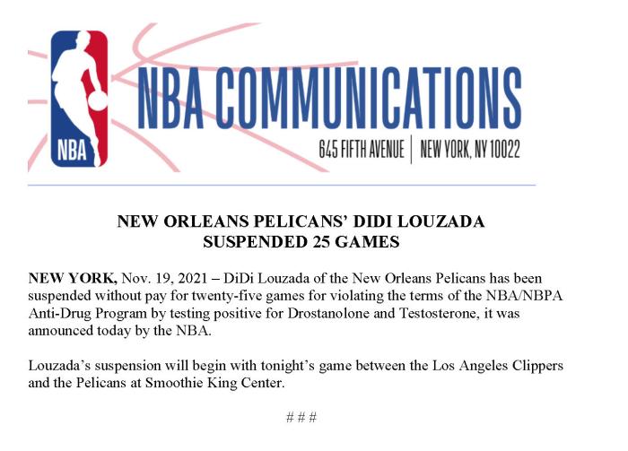 来源:24直播网11-20 15:2924直播网11月20日讯 ,NBA官方开出罚单,鹈鹕后卫迪迪-洛扎达因违反联盟的禁药规定,被禁赛25场。官方表示,洛扎达的屈他雄酮和睾酮检测结果为阳性。洛扎达的禁赛处罚讲出今晚对快船的比赛开始生效。