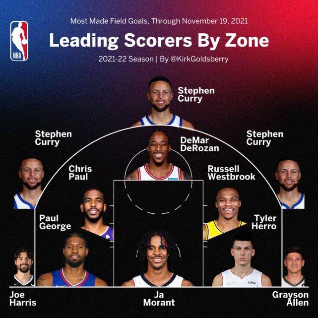 来源:24直播网11-20 15:2224直播网11月20日讯 ,数据专家Kirk Goldsberry公布了新赛季至今的各区域得分王。在划分的11个区域里,库里独占三席,统治三分线。灰熊新星莫兰特则称霸禁区,他本人也对此做出回应。