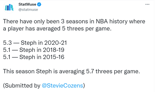 StatMuse的数据显示,在这个赛季前,NBA历史上只有三个赛季有球员场均命中至少5记三分,分别是2015-16赛季的库里(5.1个)、2018-19赛季的库里(5.1个)和2020-21赛季的库里(5.3个)。本赛季至今,库里场均命中5.7个三分,状态更加疯狂。