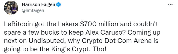 湖人记者Harrison Faigen发推写道:LeBitcoin(勒-比特币)给了湖人7亿美元,却没有钱留下卡鲁索吗?加下来将会争议不断,为什么Crypto球馆成为了国王的地盘。