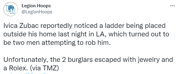 湖人旧将遭入室抢劫!目睹两名小偷逃跑,珠宝名表被盗走并已报警