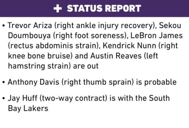 湖人官方也更新了对公牛一战的伤病名单,詹姆斯确定缺阵,和他一起缺席的还有阿里扎、敦布亚、纳恩和里夫斯,敦布亚是新伤兵,他的伤情是右脚酸痛。好消息是布拉德利的名字已经从伤病名单上消失。浓眉(右拇指扭伤)是大概率出战的状态(probable,上场可能75%)。目前,湖人8胜6负,排名西部第七,过去4场比赛,他们赢下了3场,状态有所反弹。