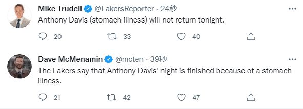 第二节比赛期间,湖人官方正式宣布浓眉因胃病而退出本场比赛,本场数据定格在7分钟5投1中仅2分3篮板,本就是带伤出战,却又生病了。