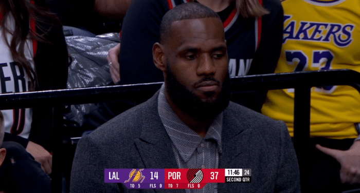 第二节镜头给到詹姆斯,36岁老詹坐在替补席观战,却一脸无奈和落寞;詹姆斯遭遇腹部拉伤,本赛季已经因伤缺席4场比赛,预计还会伤停两场比赛。