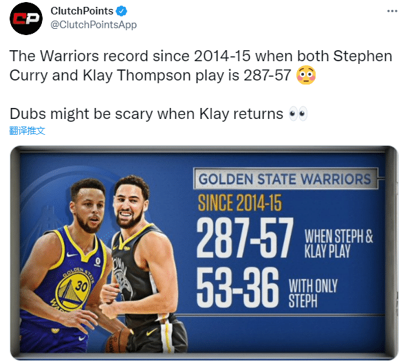 在这段时间内,勇士水花兄弟合体的战绩很出色,而库里单核带队的战绩是53胜36负;对于这样的战绩,美媒ClutchPoints发推写道:当克莱伤愈复出时,勇士可能会变得更加可怕。