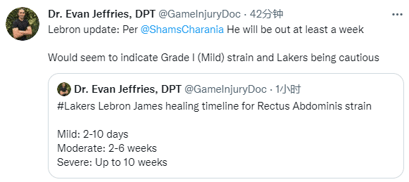 据医学专家Evan Jeffries跟进报道,詹姆斯因伤至少休战一周,似乎表明詹姆斯的腹部是一级(轻度)拉伤;勒布朗-詹姆斯腹部拉伤这种伤病康复的具体时间表——轻度拉伤至少休战2-10天;中等拉伤至少休战2-6周;重度拉伤则需休战至少10 周。