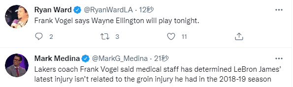 湖人队主教练弗兰克-沃格尔表示,湖人医务人员已经确定詹姆斯的腹部伤病与他在 2018-19 赛季的腹股沟伤势无关;沃帅还希望詹姆斯的伤势不严重,并且透露詹姆斯在上一场第四节注意到自己的腹部受伤,带伤打完比赛;对于詹姆斯缺阵,沃格尔表示:你不能取代勒布朗所做的,但其他人必须把他们的事情做的更好。