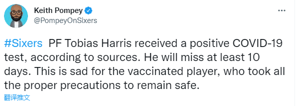 据76记者Keith Pompey报道,76人前锋托拜亚斯-哈里斯的新冠检测结果为阳性,至少缺席10天,这对接种疫苗的球员来说是可悲的,他采取了所有适当的预防措施来保证安全。