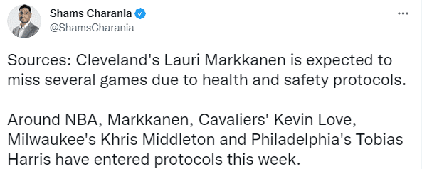 骑士官方宣布,马尔卡宁触发健康与安全防疫协议,确定缺席与开拓者的比赛,预计缺席几场比赛,骑士全队都已接种疫苗,但马尔卡宁和乐福仍旧因违规而被隔离。