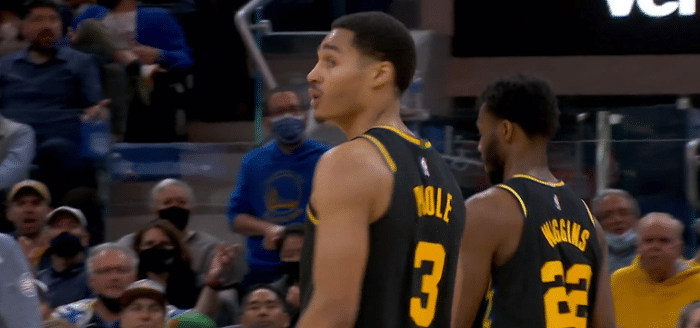 第三节4分13秒,本场状态火爆的普尔不满被推倒却没有哨,之后他情绪失控,挥拳怒吼选秀宣泄情绪,裁判给他一个技术犯规;本场比赛,普尔三节投进7记三分,18投10中轰下29分,犹如偷走了库里的技能包似的,普尔又泡开了,勇士三节80-67领先13分。