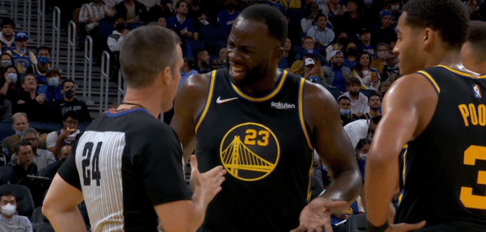 第三节8分08秒,格林在进攻中被吹掩护犯规,之后格林喋喋不休抱怨裁判,之后吃到技术犯规,格林找裁判理论,无奈摊手仍无济于事,这是格林本赛季第一次吃T。