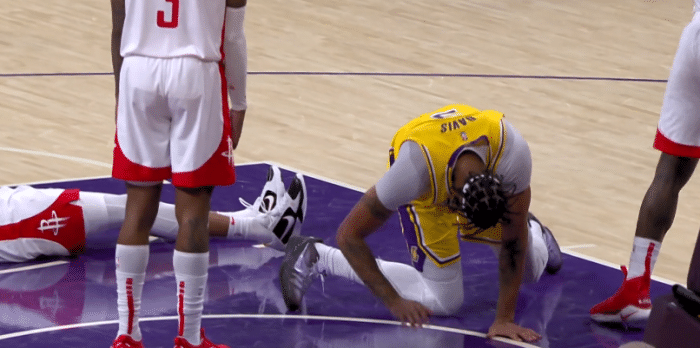 第二节5分24秒,浓眉持球单打申京,发力时踩到对手的脚,导致另外一只脚崴了一下,之后浓眉捂着脚踝坐在地板上,缓了一会后,威少和队友一起拉起浓眉,浓眉崴脚后没有下场休息,继续留在场上是一个好兆头,脚踝伤势无大碍。