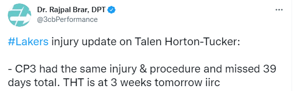 据医学专家Rajpal Brar报道,太阳球星保罗也曾遭遇同样的伤病和手术,总共养伤用了39天,现在霍顿-塔克是伤后的第三周;很明显,20岁霍顿-塔克的伤愈结果很喜人,很神速。