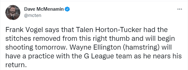 来源:24直播网11-02 15:4524直播网11月02日讯 ,湖人队最新伤情更新,湖人主帅沃格尔霍顿-塔克右手拇指的缝线已被拆掉,正按照既定的时间表迈向复出,将在明天开始参加投篮训练;艾灵顿接近复出,将和湖人发展联盟球队一起训练。