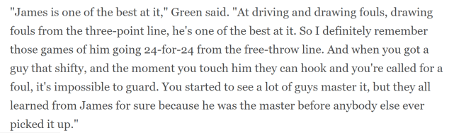 “詹姆斯(哈登)是最擅长造犯规的球员之一,”格林说。“无论是突破造犯规还是三分造犯规,他都是顶尖高手。我还记得他有一场24罚24中的比赛。当你遇到一个如此狡猾的家伙时,你一碰到他,他就会勾住你,然后你就被吹犯规了,这让你根本无法防守。后来,你看到很多球员都开始掌握这项技能,他们肯定都是从哈登那里学的,因为在所有人接触到这些之前,哈登就已经是大师级别的了。”