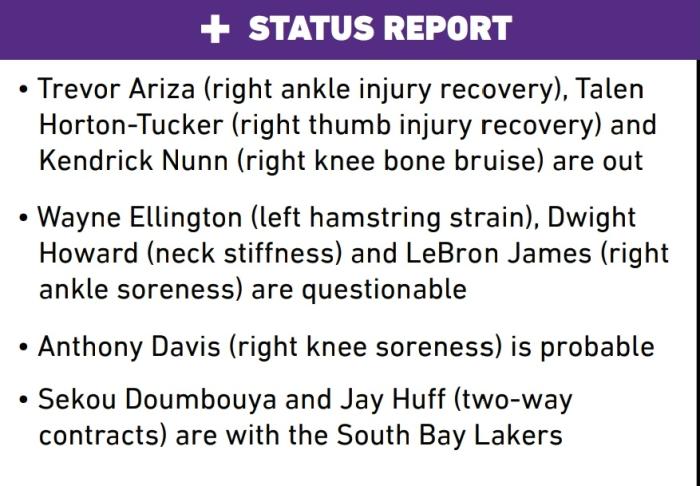 在湖人伤病名单上,阿里扎、霍顿-塔克和纳恩都是因伤继续休战,暂时没有具体的复出时间表;詹姆斯、浓眉、艾灵顿和霍华德也有伤,全队多达7名球员受伤,伤病满营太难了;此前朗多曾在比赛中不幸崴脚,所幸伤势无大碍,郎指导已经不在伤病名单上。