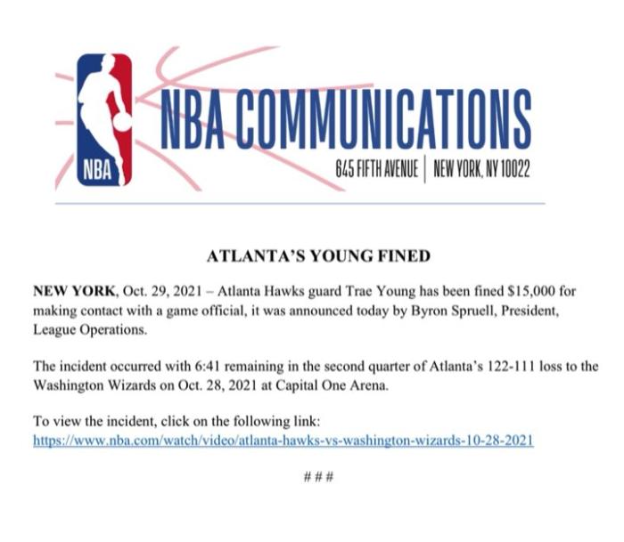NBA官宣!特雷-杨因接触裁判被罚1.5万美元,炮轰新规为众星鸣不平
