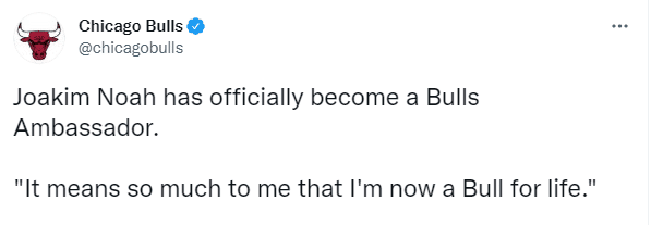 诺阿确定退役并且正式成为公牛队新的篮球大使,诺阿本人表示:这意味着很多,我一生都是公牛人。