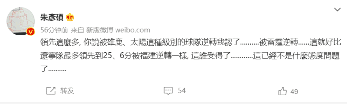 宝岛名嘴朱彦硕形容湖人这场惨遭逆转“领先这么多,你说被雄鹿、太阳这种级别的球队逆转我认了...被雷霆逆转...这就好比辽宁队最多领先到25、6分被福建逆转一样,这谁受得了...这已经不是什么态度问题了”哈哈,把他们用CBA一弱一强的球队来对比,话说回来CBA强弱更悬殊,福建不可能逆转辽宁25分26分!