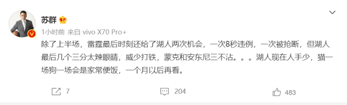 现在还是谈谈湖人这场被逆转吧,前湖人球员霍里表示湖人太大意了,上半场就以为比赛打完了,下半场太放松,应该吸取教训!苏群点评,最后雷霆给了湖人机会但没把握住,蒙克和安东尼的三不沾,威少干拔三分打铁,这就没办法了,球队人手短缺,还需要调整!