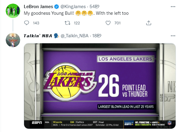 威少、浓眉对于惨遭大逆转很不爽,不过詹姆斯貌似看得很轻,赛后,詹姆斯第一时间发推盛赞骑士新星塞克斯顿,发推写道:我的天啊,年轻的公牛(注:塞克斯顿自诩的绰号)。