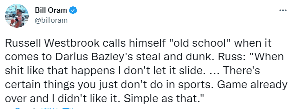 赛后威少回应吃到第二个技犯被驱逐离场这件事,他称自己很老派,并且表示:当这样的事情发生时,我不会让它溜走……有些事情你在体育运动中是不该做的。比赛已经结束了,我不喜欢它(贝兹利扣篮);就这么简单。