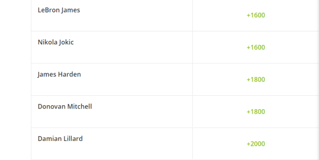 以下是前10位的具体排名及赔率数据:库里(+400)、字母哥(+500)、东契奇(+550)、杜兰特(+600)、恩比德(+1000)、詹姆斯(+1600)、约基奇(+1600)、哈登(+1800)、米切尔(+1800)、利拉德(+2000)。